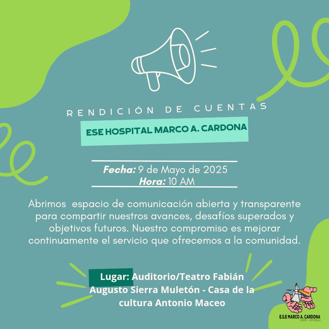 Se invita a la población en general a la rendición pública de cuentas de de la E.S.E Hospital Marco A. Cardona vigencia 2018, la cual se realizara el día 9 de Mayo de 2025 a las 10:00 PM en el auditorio Teatro Fabián Augusto Sierra - Casa de la cultura Antonio Maceo