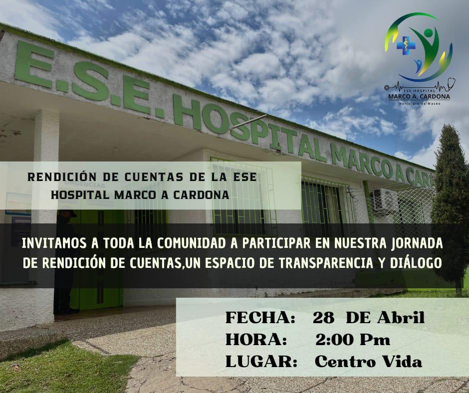La E.S.E Hospital Marco A. Cardona invita a la población en general a la rendición pública de cuentas vigencia 2025, la cual se realizara en el CENTRO VIDA de Maceo, por consiguiente esperamos su participación en el evento, para el Hospital es muy importante su asistencia.